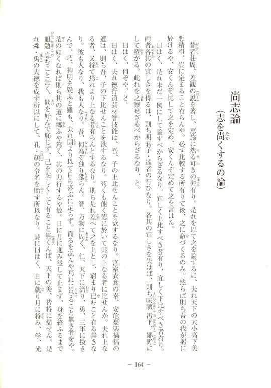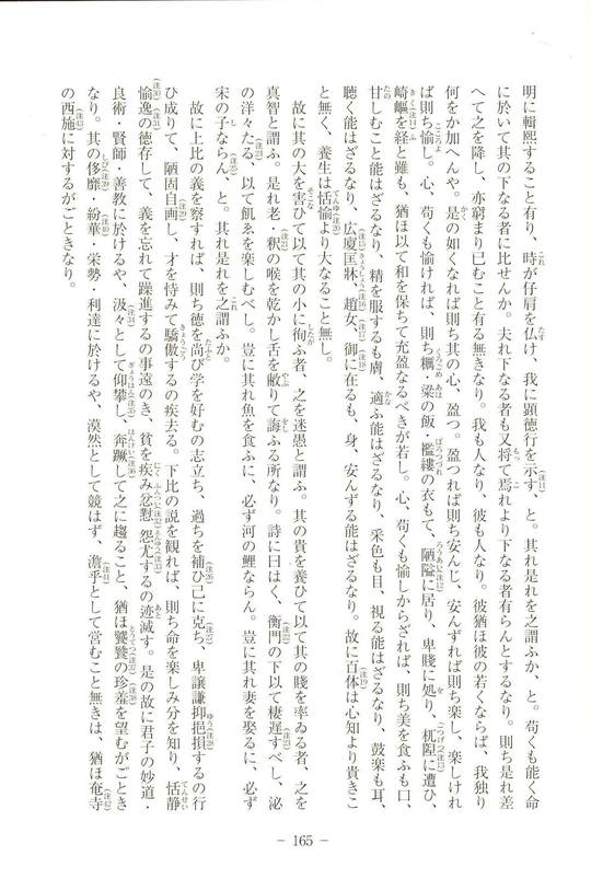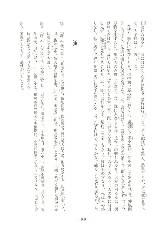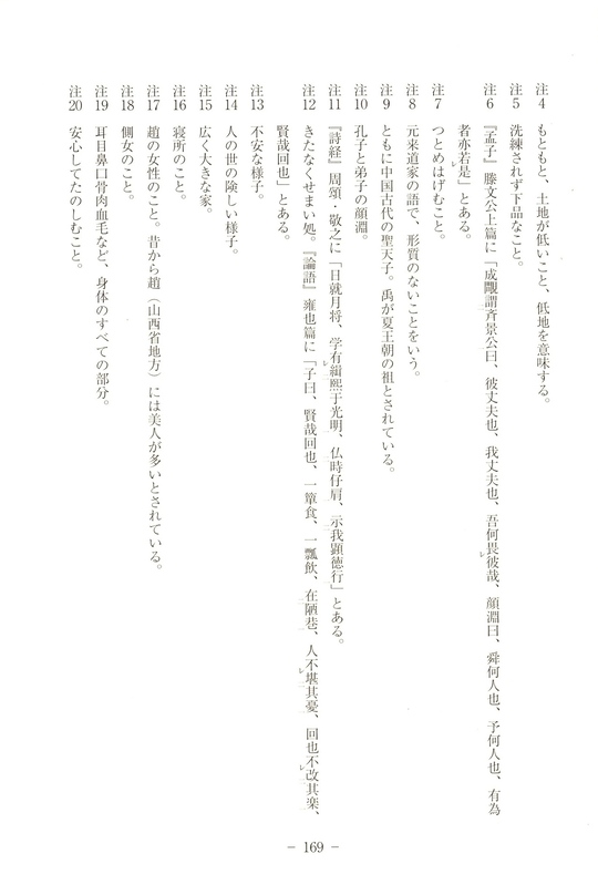 四、注は語句の解釈と出典をあげたが、各篇によって精粗の差があり、出典については調査不十分なものが残っている。それらについては今後の補訂に俟ちたいと思う。尚、『論語』については鈴木朖の『論語参解』によった。又訳注の最後に各篇の原稿の成立時期の推定されるものを示す一覧表を付した。