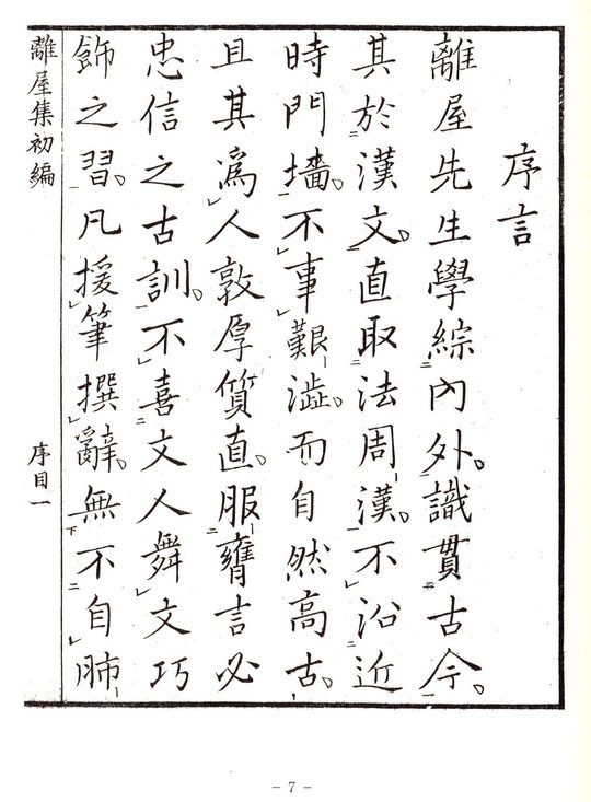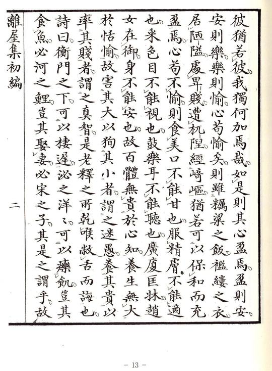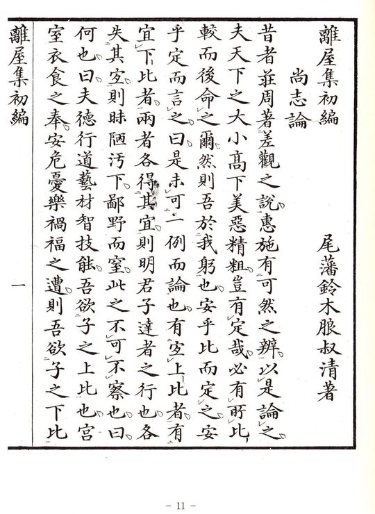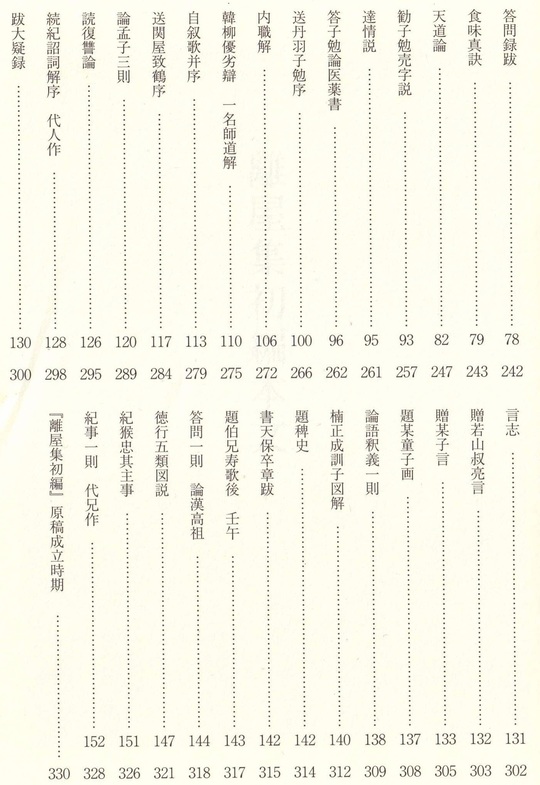 二、『離屋集初編』には文政十一年堀田中倫の序を附した初刷本があり、後刷本とは本文に於いて若干の語句の相違がある。又各篇の文章は早く「離屋文稿」や「離屋文抄」などに書かれたものもあり、それらの本文との間にも相違がある。ここではそれらにはふれず、専ら後刷本によった。後刷本は著者によって訂正、検討が加えられているからである。それらのことについては『鈴木朖 百三十年記念』に於いて、市橋鐸氏の解説がある。