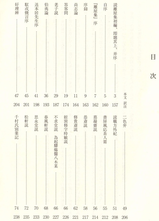 然らば彼の主著は何かと問われるならば、私は『離屋学訓』を第一に推す。これは彼の学問体系を理論的に説述したもので、前記の「答客問」を成熟完成させたものである。その名称からみた「学びの訓」という如き、初心者向けの啓蒙書とは異なる、極めて高度な、和漢を総合した学問論である。これを精読することなくしては、彼の学問を語ることができない。更にもう一つの著『離屋集初編』がある。これはその思想、信条を具体的に示し、彼を知る上で、まことに格好の書である。そこには中国哲学、思想に対する独自の見解が述べられていると共に、随筆的に日常の学問生活や交友、主張などが率直に語られていて、貴重である。しかもその諸篇は多く壮年期に書かれたもので、まさに前記『離屋学訓』の内容と相応ずるのである。