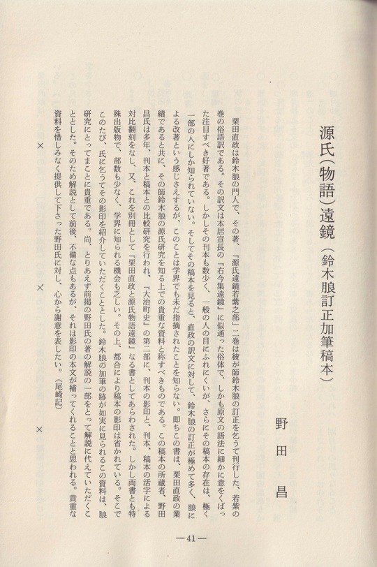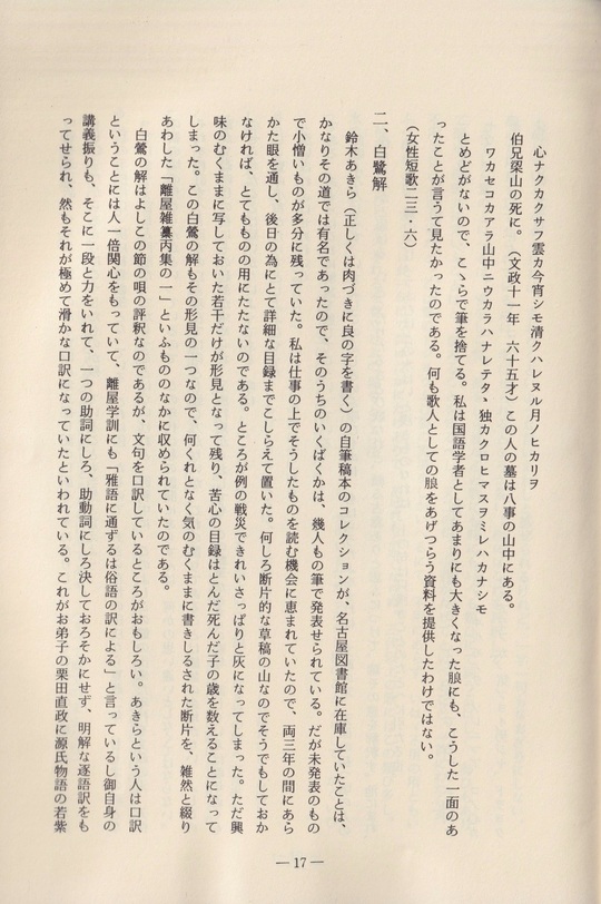 鈴木あきらの自筆稿本のコレクションが、名古屋図書館に在庫していたことは、かなりその道では有名であった。後日の為にとて詳細な目録までこしらえて置いた。何しろ断片的な草稿の山なのでそうでもしておかなければ、とてもものの用にたたないのである。ところが例の戦災できれいさっぱりと灰になってしまった。ただ興味のむくままに写しておいた若干だけが形見となって残り、この白鷺の解もその形見の一つなので、何くれとなく気のむくままに書きしるされた断片を、雑然と綴りあわした「離屋雑纂丙集の一」といふもののなかに収められていたのである。