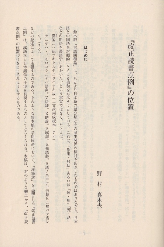 鈴木朖『言語四種論』は、もとより日本語の語分類とその派生関係の検討をめざしたものではありながら、日本語と中国語を対照的にとらえる姿勢をも示そうとしている。そのような鈴木朖の学問体系において、「漢籍読」を主題とした『改正読書点例』は、漢語学と日本語学の干渉を具現するものとしてとらえられる。