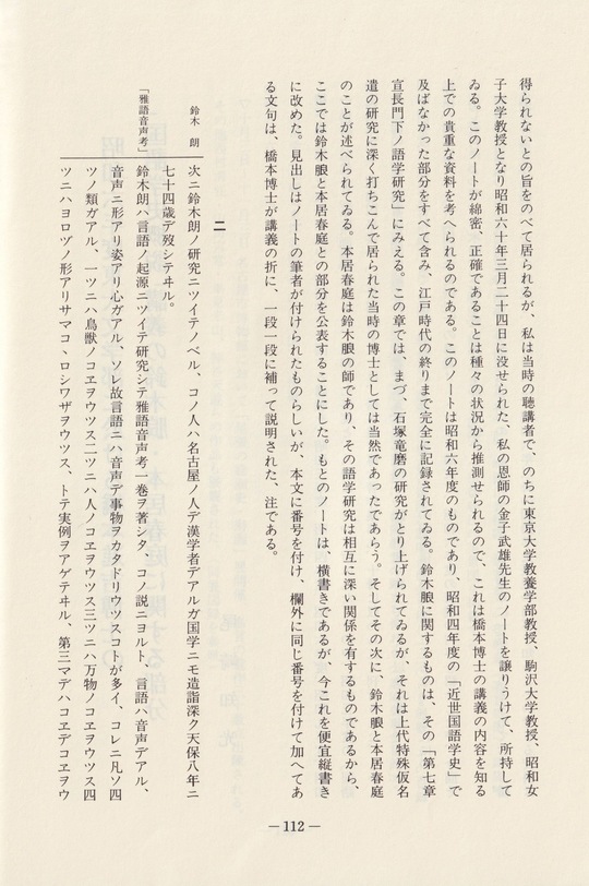 私の恩師の金子武雄先生のノートを譲りうけて、所持している。これは橋本博士の講義の内容を知る上での貴重な資料と考へられるのである。鈴木朖に関するものは、その「第七章宣長門下ノ語学研究」にみえる。