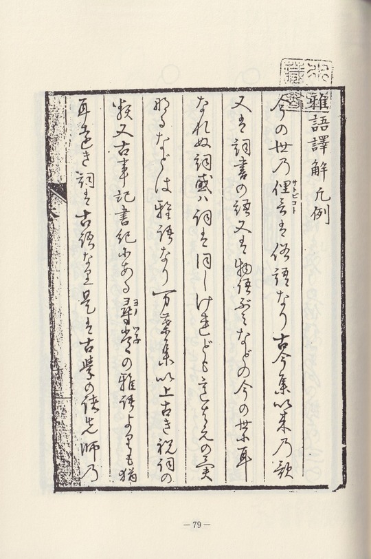 今回影印に付する『雅語訳解原稿』と題する本は、表紙はもとの紙がいたみ、破損したので、厚手の紙の上にその一部をはりつけ、新しく付けられたものである。そしてその中央に、 植松茂岳筆 鈴木朖加筆 雅語訳解原稿 としるす紙がはり付けられている。このはり紙は本文筆者のなせるわざではなく、改装時にその所持者が「植松茂岳が書写し、鈴木朖が加筆した稿本」と認定してその旨をしるしたものと思われる。
