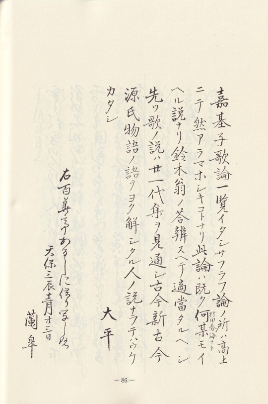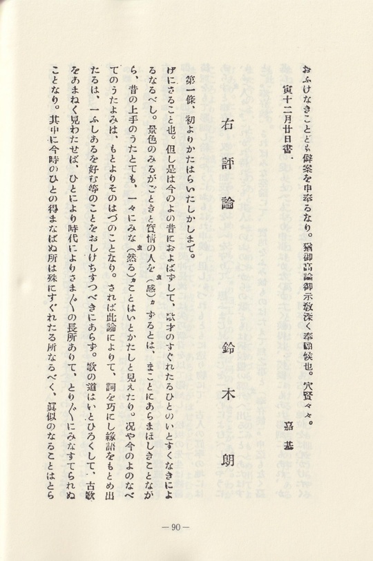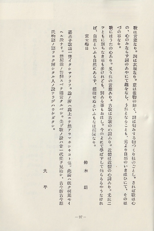 大平は両者の優劣は言はず、森嘉基の論については、「高上ニテ然アラマホシキ」と評し、鈴木朖の評については「スベテ適当タルベシ」といふ。つまり、両者のそれぞれの論の本質を射て、意味深長な表現となってゐる。