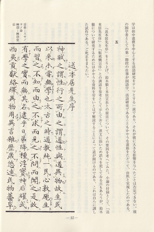 鈴木朖の研究において、彼の漢文の作品はまだ十分活用されてゐないが、それらを丁寧に読むと新しく開発されることが多い。ここにとり上げる「送本居先生序」は、『離屋集初編』に収められて居り、本居宣長に対する熱烈な傾倒を吐露したものとして甚だ著名である。宣長の国学のどのやうな面に強くひかれたかを、自ら語ってゐるものとして、彼の学問形成をたどる上での重要な資料である。