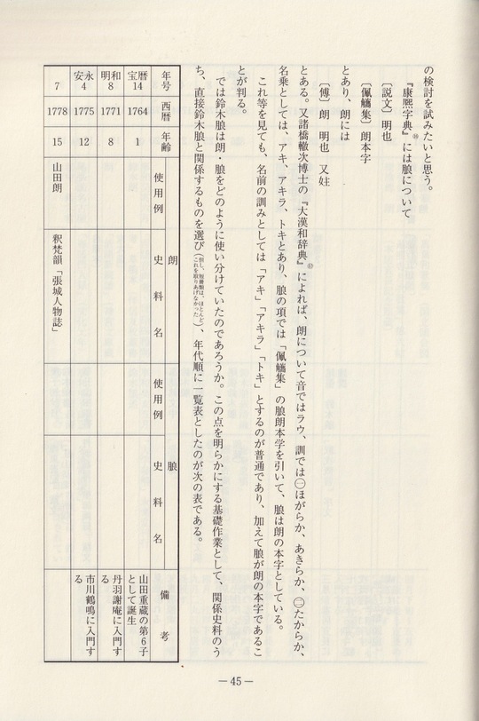 しかし、安永七年(一七七八)釈梵韶の著した『張城人物志』文苑部には 山田朗 と見えており、寛政十二年(一八〇〇)筆の朖自筆本『活語活用格』(奥書)をはじめ、多くの著書や書に“朗”の字の使用が認められる。