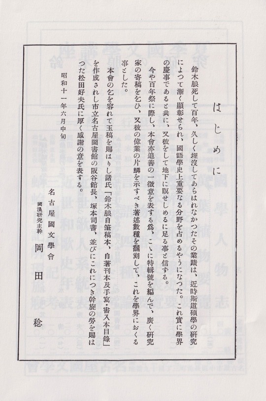 昭和十一年六月中旬 名古屋國文學會 國漢研究主幹    岡田 稔