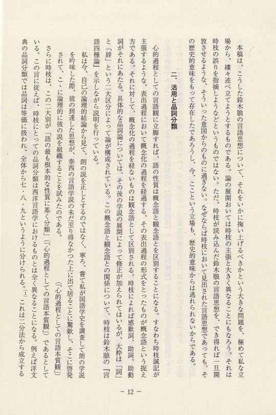 それでは、この「過程」という観点を時枝にもたらした国語学史上の知見は何であるのか。これも今日では学史上の基本事項であるだろう。言うまでもなく鈴木朖の『活語断続譜』や『言語四種論』からうかがえる言語思想である。とりわけ『言語四種論』の一節、「テニヲハゝ心ノ声ナリ」(玉華堂刊本八丁表)はあまりにも有名であり、この主張が時枝に与えた影響も