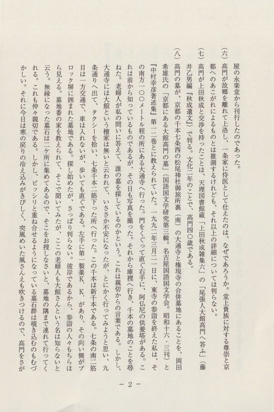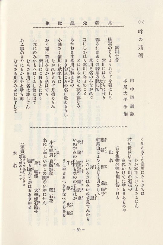 田中道麿は、尾張国学の祖である。はじめ加茂真渕流の万葉研究に精力を注いだが、本居宣長を知り、その学に敬服し、名古屋の門人と共に、宣長に入門し、万葉集や古代語、活用語研究に集中した。天明四年、六十一歳で没し、宣長もその死を追悼している。鈴木朖はその門人ではないが、その生前に逢っている。(中略)更に詳しく重要な「田中道全集」があり、その公刊が必要であるが、それは次回に試みることにし、その前にまず右の「蓬がしま」所載のものを復刊することにした。(尾崎)