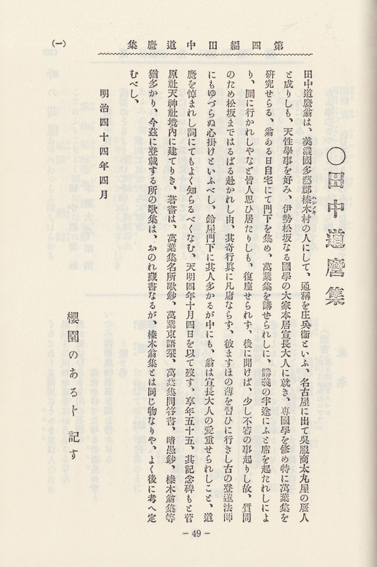 田中道麿翁は、美濃国多藝郡榛木(ハンノキ)村の人にして、通称を庄兵衛といふ。名古屋に出て呉服商本丸屋の雇人と成りしも、天性学事を好み、伊勢松阪なる国学の大家本居宣長大人に就き、専国学を修め特に萬葉集を研究せらる、翁ある日自宅にて門下を集め、萬葉集を講ぜられしに、講義の半途にふと席を起たれしにより、厠に行かれしやなど皆人思ひ居たりしも、復座せられず、後に聞けば、少し不審の事起りし故、質問のため松坂まではるばる赴かれし由、其奇行眞に凡庸ならず、(以下略)