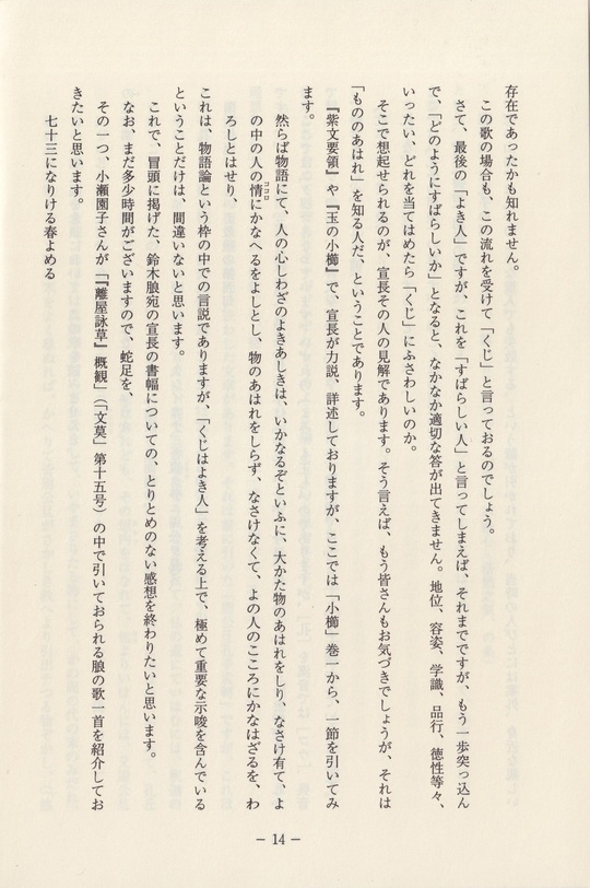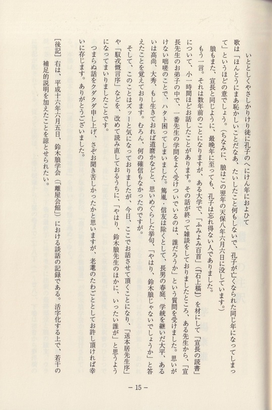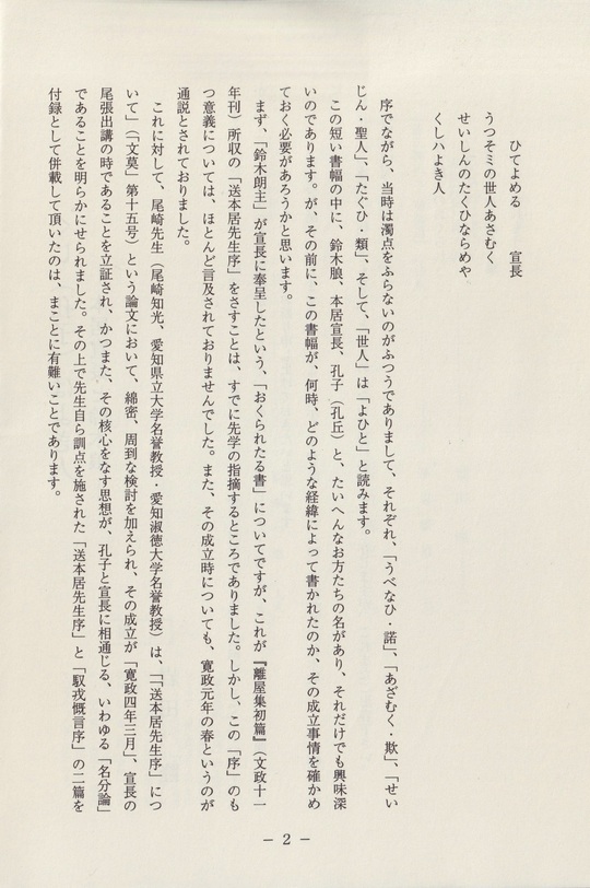 これに対して、尾崎(知光)先生は、「「送本居先生序」について」(「文莫」第十五号)という論文において、綿密、周到な検討を加えられ、その成立が「寛政四年三月」、宣長の尾張出講の時であることを立証され、かつまた、その核心をなす思想が、孔子と宣長に相通じる、いわゆる「名分論」であることを明らかにせられました。その上で先生自ら訓点を施された「送本居先生序」と「馭戎概言序」の二篇を付録として併載して頂いたのは、まことに有難いことであります。