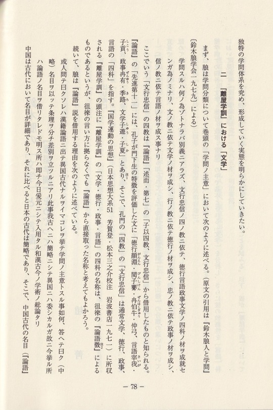 本稿は『離屋学訓』における朖の学問分類を見渡し、彼が求めた学問とはいかなるものかを考えるにあたって、『離屋学訓』の四科(文学・徳行・政事・言語)の中で基本とされる「文学」を分析し、さらに彼の独創性を「言語」科において見出すことを試みる。