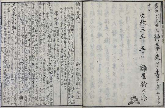 『論語参解』は鈴木朖による『論語』の注釈書である。その内容は、朖が『論語』の原文に訓読を施した本文と、それについての朖自身による注とから成っている。注は二行に割って、漢字片仮名交じり文で表記されてゐる。