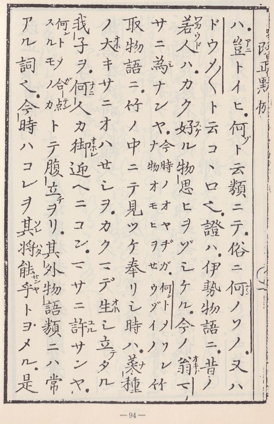 今漢学者字音を正す事のみを知て、訓のさだを忽にし、漢語の意さへたがはざれば、和訓の心はあたらでも苦しからずと思ひをるは、本末の弁へなく、御国の言霊(コトタマ)に対しても恐れある事なり。また今の漢籍読に御国の古語の伝はりたる事あり。師の此書を読ひとさる類ひを弁へ得ば、漢籍も亦御国学ひの便りとなること有べし。
