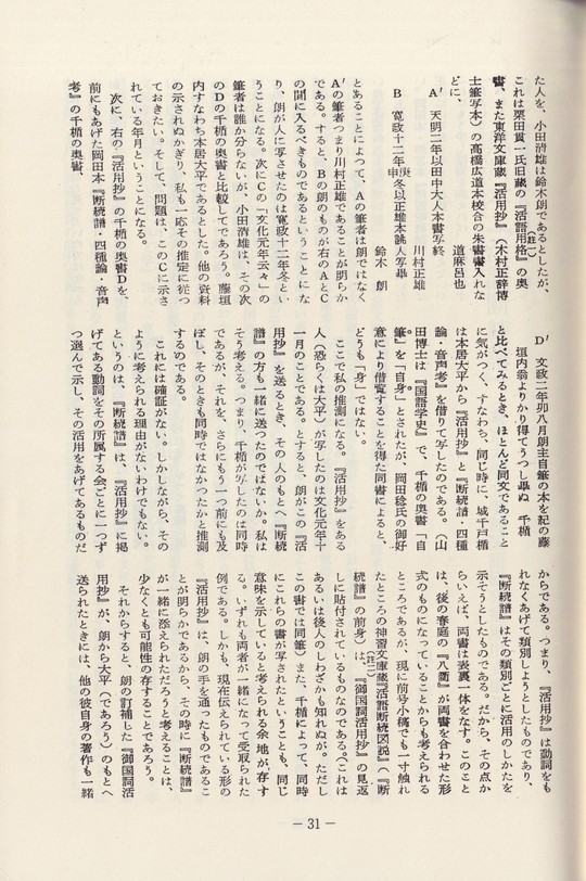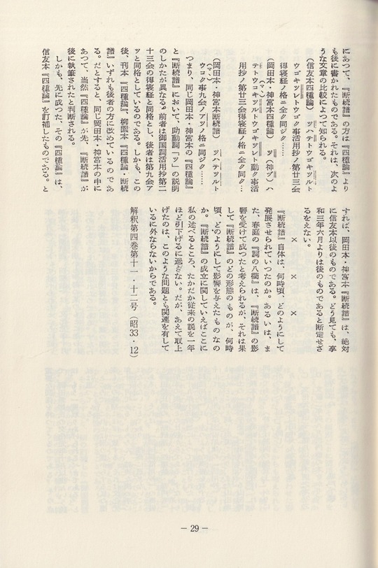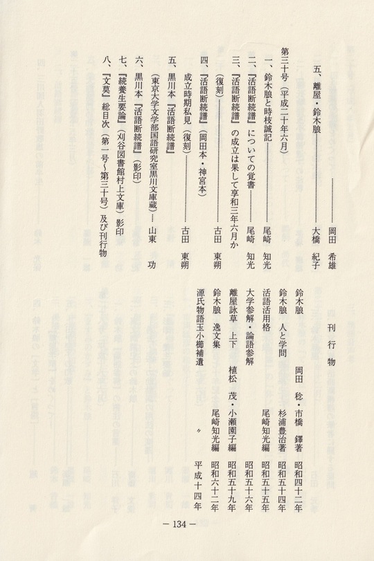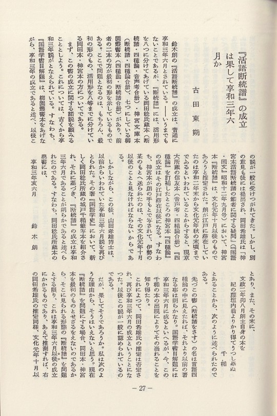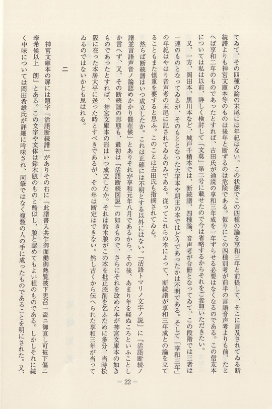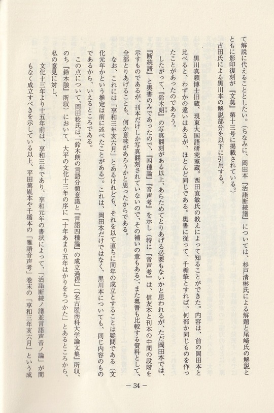このたび取り上げる東京大学文学部国語研究室黒川文庫所蔵『活語断続譜』も、城戸千楯写本という点で岡田本と同系統ということまではわかるのだが、これが神宮文庫本とはいかなる関係にあるのかとなると、これまた確かなことはよくわからなくなる。(中略)そこで今回、改めて東京大学文学部国語研究室のご協力のもとに、原本影印を本誌に掲載させて頂くことになった。