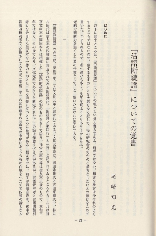 以下に記すところは、『活語断続譜』についての粗々しい覚え書きである。研究ではない。精密な検討は今や私のよくするところではないので、感ずるままのことを次第もなく記しで、後の研究者の何かのご参考としたいとの願ひをこめて老齢で判断力を無くした者の仕業として、ご一覧いただければ幸ひである。