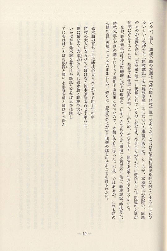 右の文章は、平成十九年六月二日、鈴木朖百七十年記念の折に、鈴木朖学会で講演したものの記録である。文章としてはととのわないところがあるが、なるべくそのときの話を再現しようと思い、多少の訂正の外は手を加えていない。但し、講演の際の演題は「鈴木朖と時枝学説」であった。これは先師時枝誠記を呼び捨てにするには忍びないという気持から「時枝誠記」を「時枝学説」としたという事情もあった。ところが、本稿校正の段階で、同題のものが金岡孝氏に「文莫六号」に掲載されているのに気付き、今更自らのうかつに愕然とした。同題の文章が同誌に存在することは、校正文献処理上混乱を招く。このため、やむをえず、題名を変更せざるをえなかった。