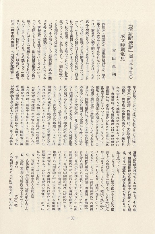 鈴木朖の『活語断続譜』には、神宮文庫本、岡田本、柳園叢書本といった諸本が存在しているが、それら諸本間の関係については、すでに尾崎知光氏や古田東朔氏らによる綿密な検討によって、おおよそのところが明らかになっている。しかしながら(中略)、資料上の制約から、未だ不明な点が多いというのも事実である。