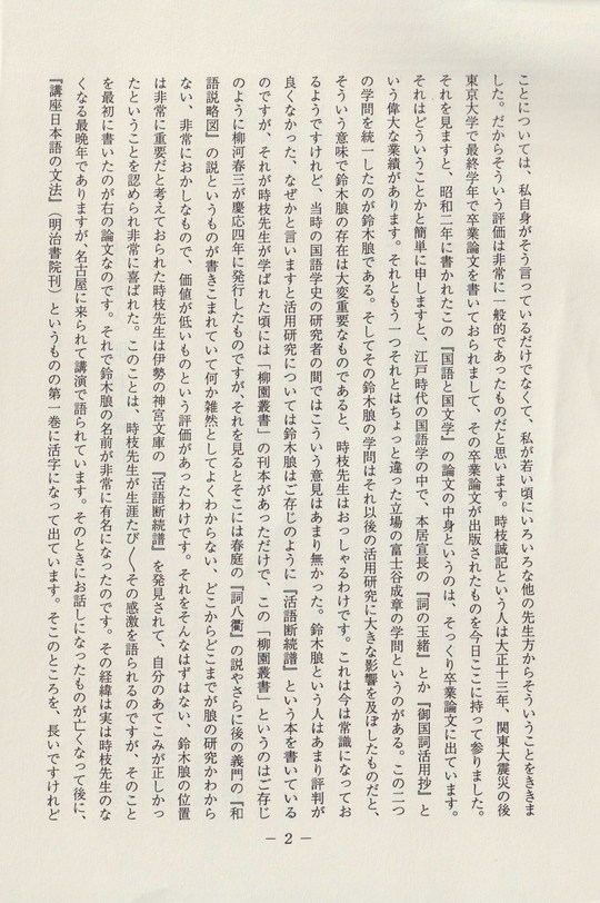 昭和二年の一月の『国語と国文学』に「鈴木朖の国語学史上に於ける位置に就いて」という論文が出ました。筆者は時枝誠記という人で、言語過程説による言語理論を打ち出して一期を画した大学者であります。大学を出て二、三年たった頃にお書きになったものなのです。これが鈴木朖を世に出してものだということについては、私が若い頃にいろいろな他の先生方からききました。江戸時代の国語学の中で、本居宣長の『詞の玉緒』とか『御国詞活用抄』という偉大な業績があります。それともう一つちょっと違った立場の富士谷成章の学問というのがある。この二つの学問を統一したのが鈴木朖である。そしてその鈴木朖の学問はそれ以後の活用研究に大きな影響を及ぼしたものだと、そういう意味で鈴木朖の存在は大変重要なものであると、時枝先生はおっしゃるわけです。